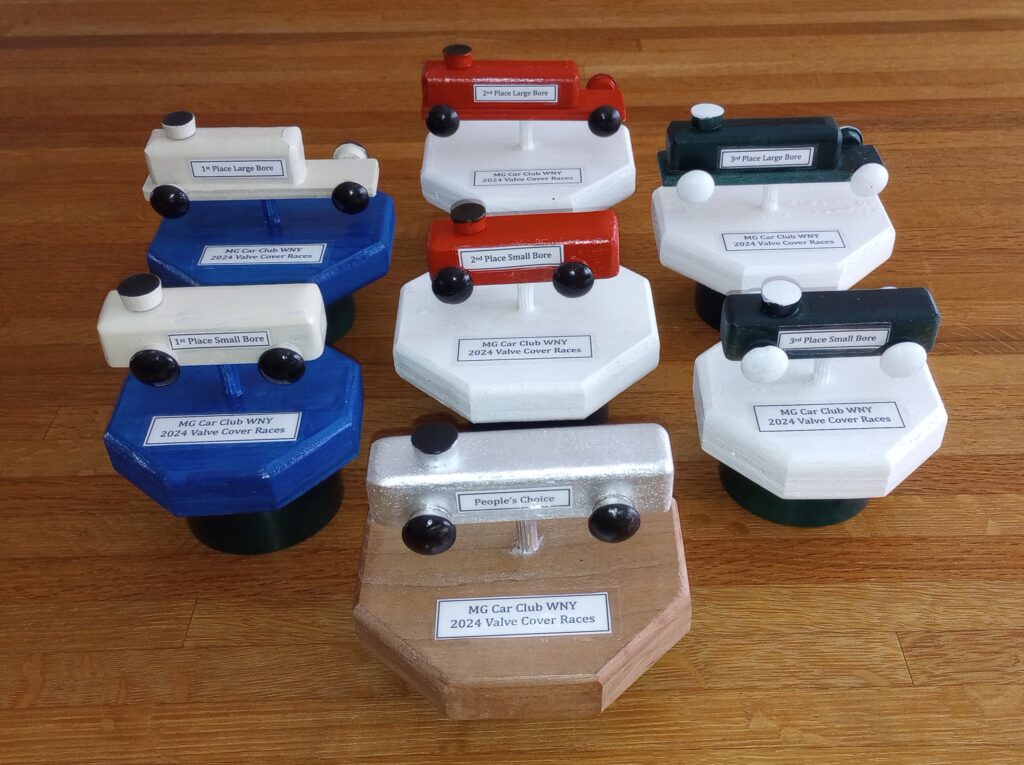 Here are this year's trophies for 1st, 2nd and 3rd in each division, plus the People's Choice award. There's plenty of time to get your racer ready - the races will be March 17th, 2024. See the Activities Calendar and elsewhere for details!